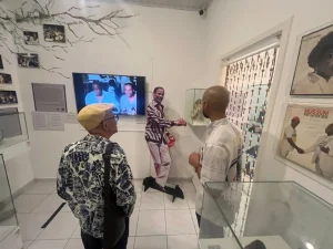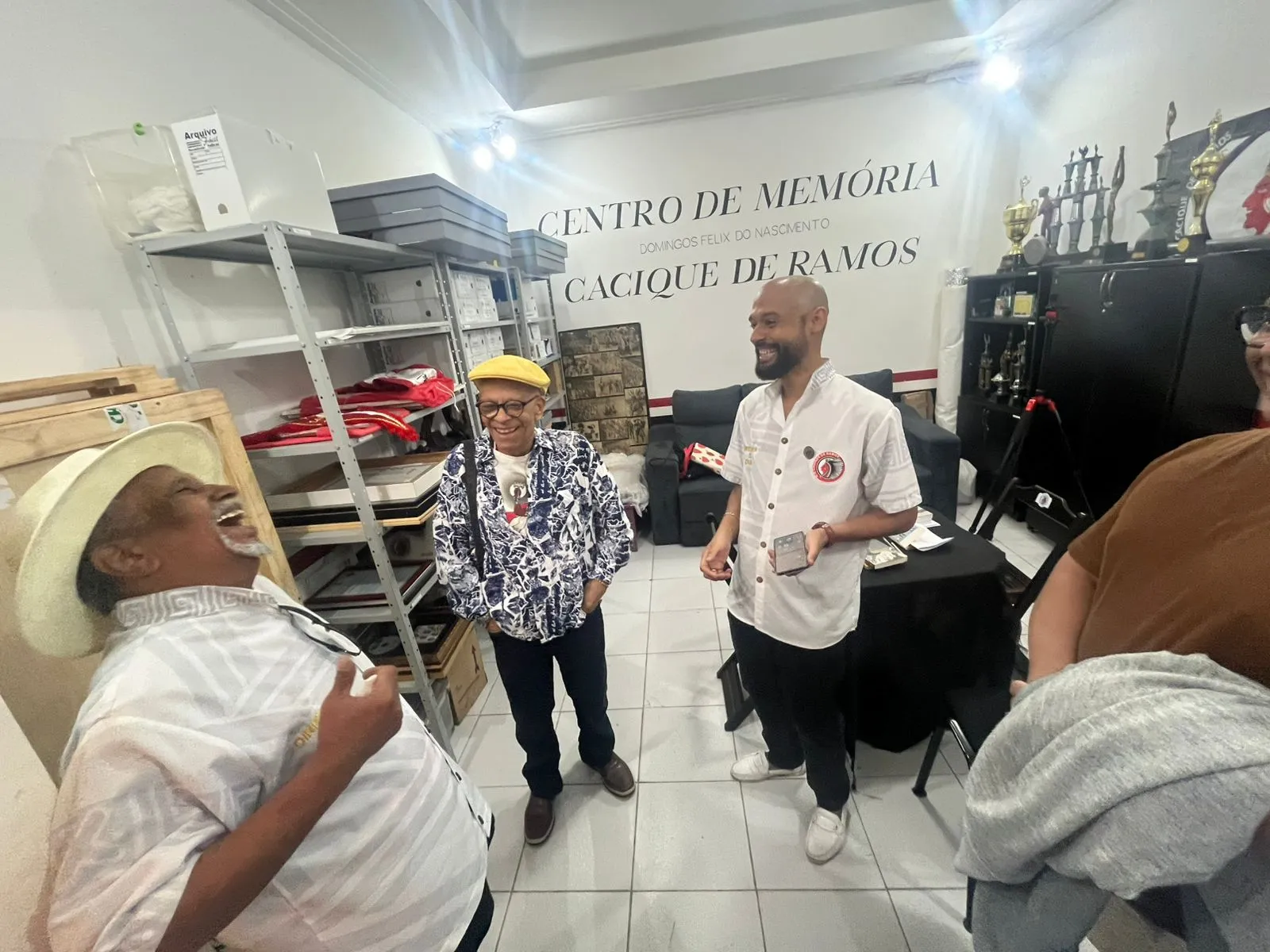 Para a nossa glória, recebemos Nei Lopes, mestre do samba, da escrita e da reflexão. Nei, acompanhado do seu filho Neizinho, foi recepcionado pela equipe do Centro de Memória – Walter Pereira, Luzia Helena Ermel e Cleber Gonçalves – e conheceu a exposição permanente “Cacique de Ramos: avenidas, quintais e afetos”, bem como a sala de acervo, onde é salvaguardado o acervo documental do Centro de Memória.